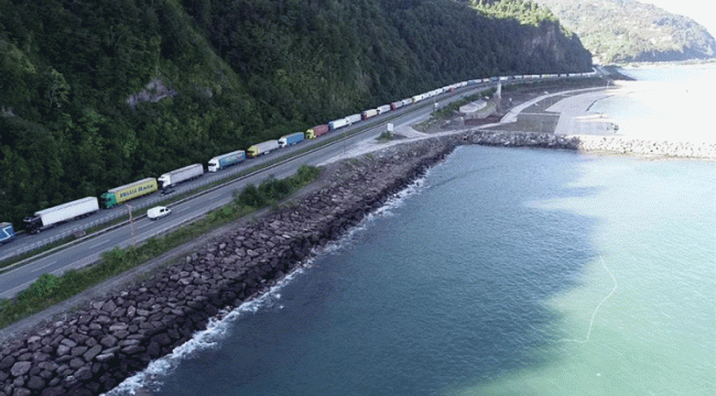 TIR parklarının dolması üzerine Karadeniz Sahil Yolu’nda oluşan kuyruk, Türk tarafında aralıklarla 15 kilometreyi buldu. TIR’lar, karayolunun bir şeridini kapattı.