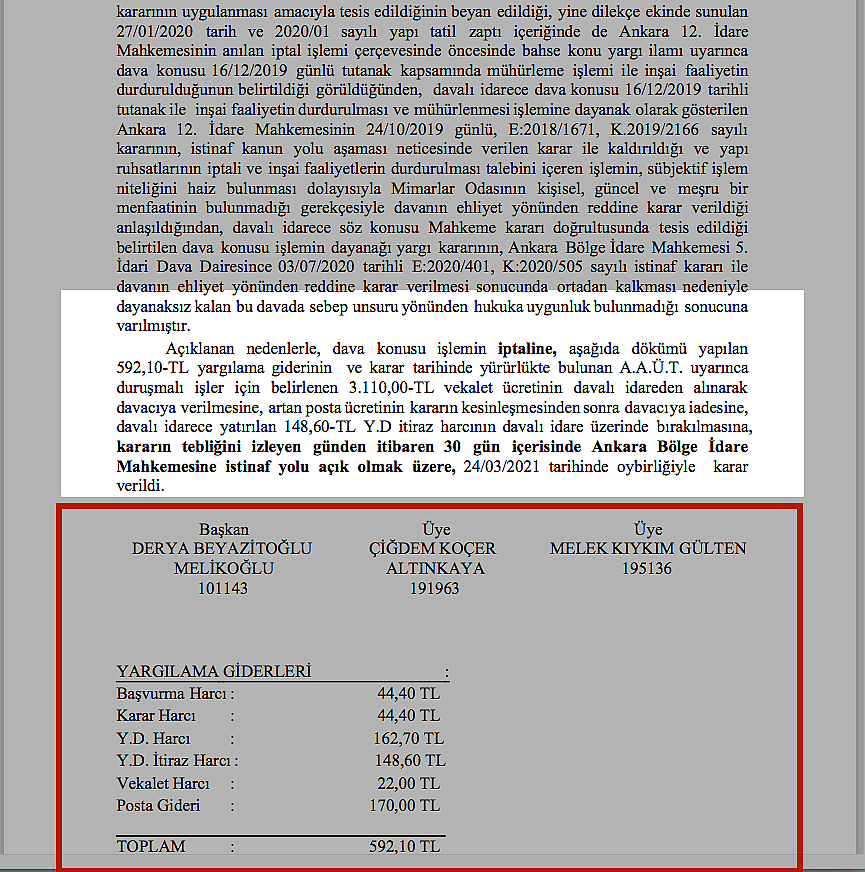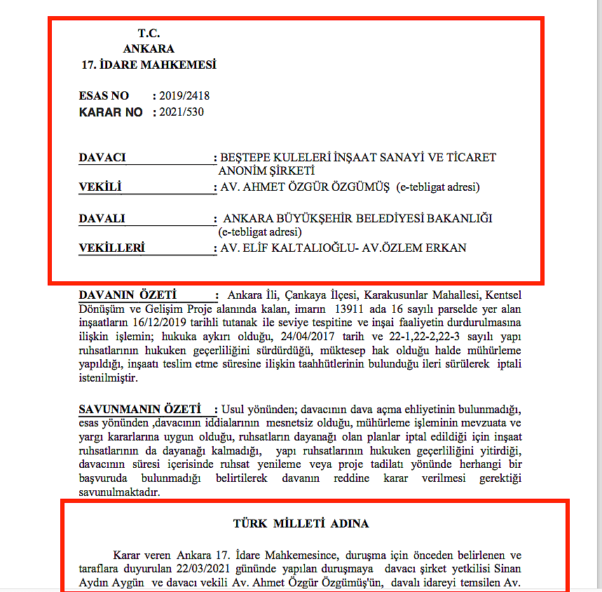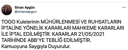 TOGO Kuleleri müteahhidi Sinan Aygün’den okul parası adı altında önce 25 milyon TL. istemesinin ardından başlayan tartışmalar uzun süre Türkiye gündemini meşgul etmişti. ankara 17. İdare Mahkemesi, Aygün’ün davacı, Ankara Büyükşehir Belediyesi’nin de davalı olduğu anlaşmazlık konusu hakkında 202/530 sayılı kararıyla son noktayı koydu. Mahkeme, inşaatı mühürlenen ve ruhsatı iptal edilen Sinan Aygün’ü haklı buldu, mühürleme kararının iptalini, belediye tarafından iptal edilen ruhsatın ise geri verilmesine hükmetti
